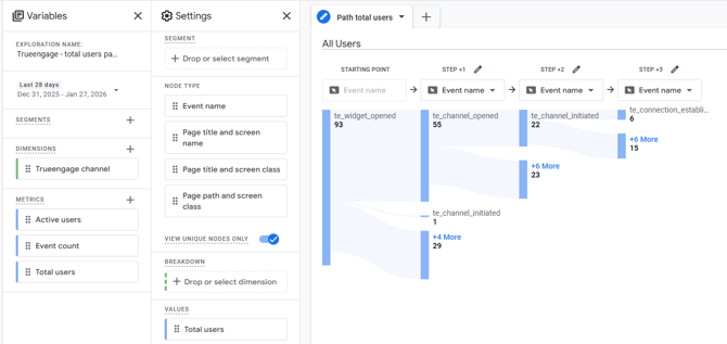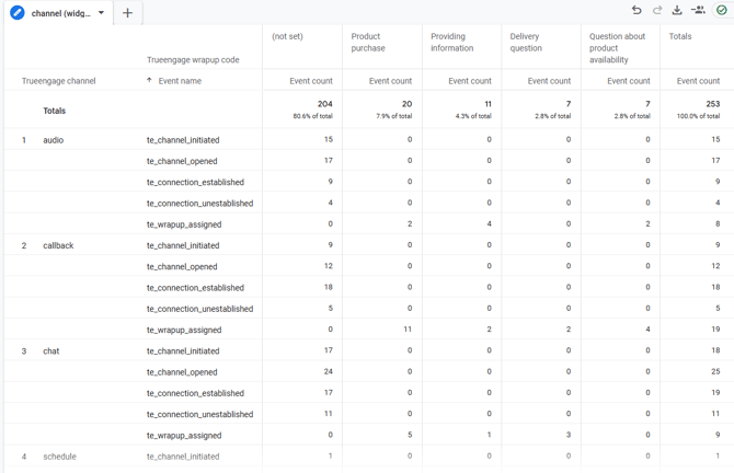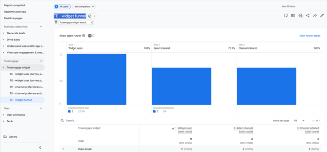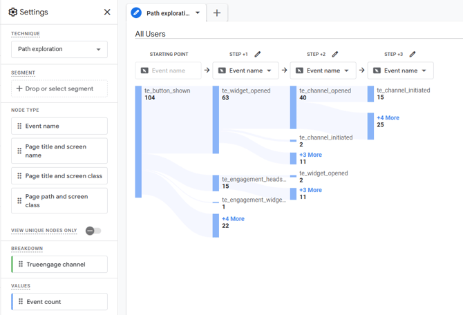 | Trueengage funnel | Event | te_widget_funnel | It allows to prepare funnel report for phases: 1 Engagement headsup shown 2 Engagement widget opened 3 Widget opened 4 Channel opened 5 Channel initiated |