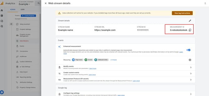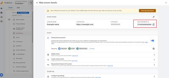 STEP 1. In Google Analytics 4, we go to Settings → Data Streams tab and select appropriate stream, there you find measurement id