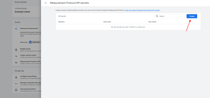 To generate API secret go in Web stream details to Measurement Protocol API secrets