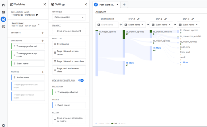 The report below allows you to track the flow of using a selected channel, starting from events on the website and ending with statuses generated on the contact center side. In the prepared report, we can see how many visitors selected a given channel on the widget (te_channel_opened). Then they used this channel for communication (te_channel_initiated). Subsequently, we report what happened on the contact center side: