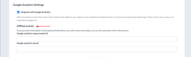 If you want to receive additional analytical data not available from the site - you can configure to receive offline events. To do this, go to TrueEngage panel Settings -> Deploy tab and configure the fields: