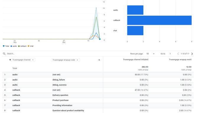 Integrating offline events is particularly attractive for callback and scheduled callback interactions. This allows us to observe flows that are extended over time (for example, whether visitors return to scheduled calls). The report below presents a sample summary illustrating the wrap-up results for interactions initiated in the widget.