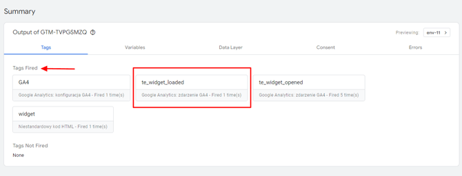 To ensure ease of use with data transmitted by the widget, we have defined a series of dimensions and events. Their full manual configuration in Google Tag Manager is time-consuming. Therefore, we offer implementation using a JSON file that can be imported into the Google Tag Manager container in merge mode. Then, after setting up the target Google Tag identifier, data is forwarded to the specified Google Analytics 4 property. From this point forward, you have an environment integrated with the TrueEngage widget that can be further customized according to specific implementation needs.