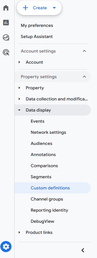To use data integration through Google Tag Manager, you need to define custom dimensions and custom metrics. To do this, in Google Analytics go to Admin → Property settings → Custom definitions.