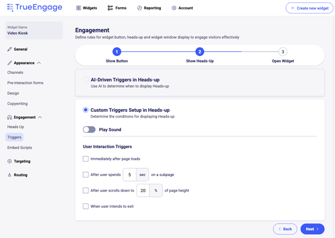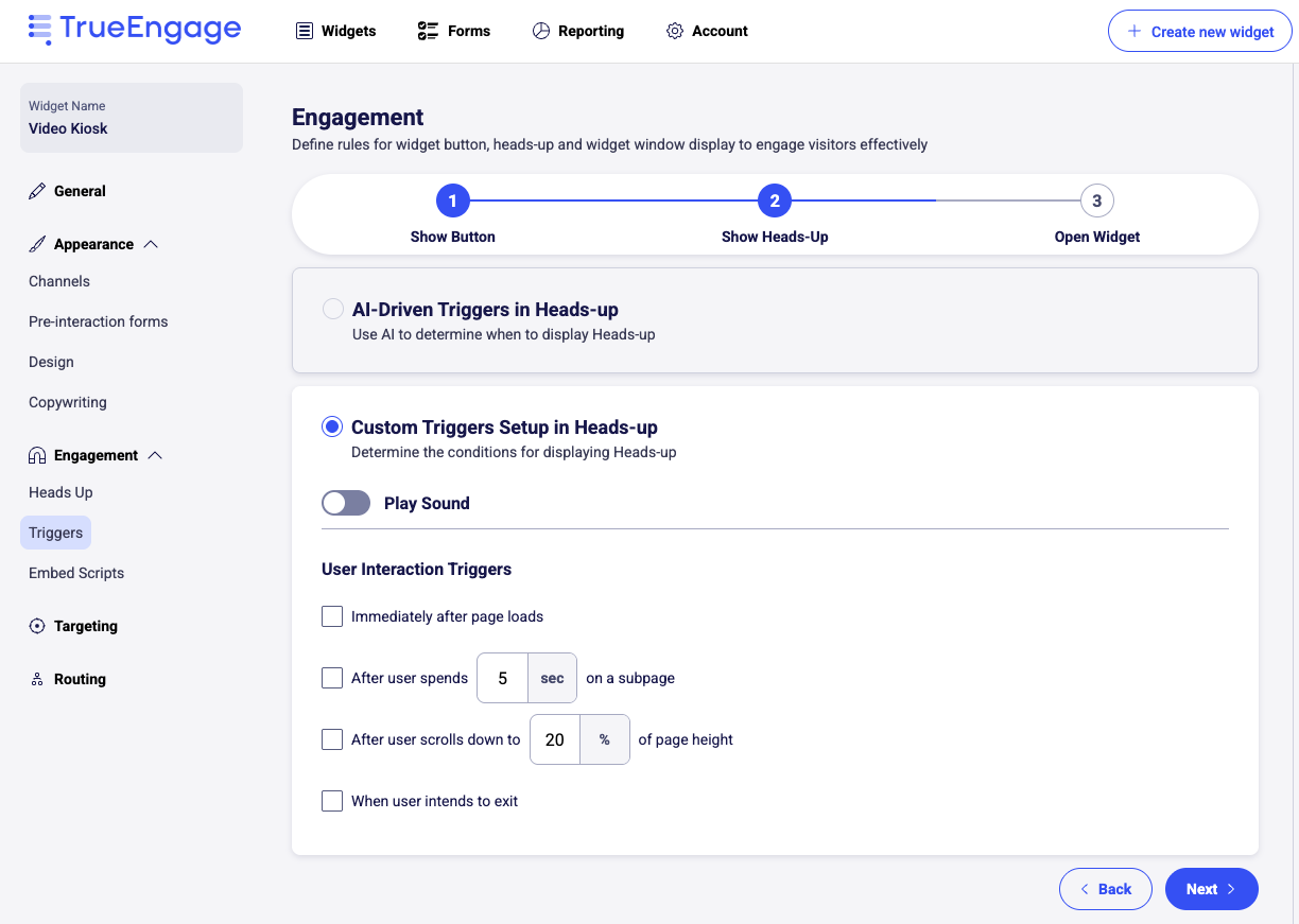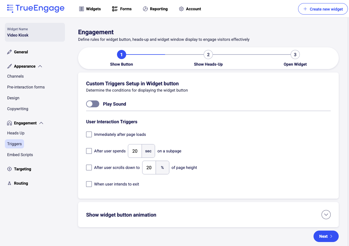 Define how and when the widget appears (e.g., after time on page or user scroll).