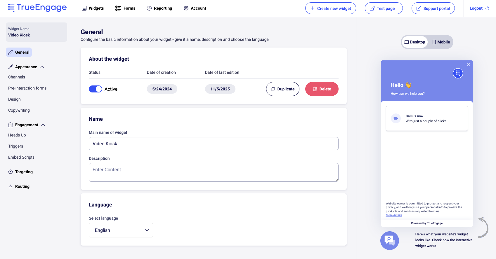 Under General → Name, give your widget a clear name such as “Voice Kiosk” or “Video Kiosk”.
