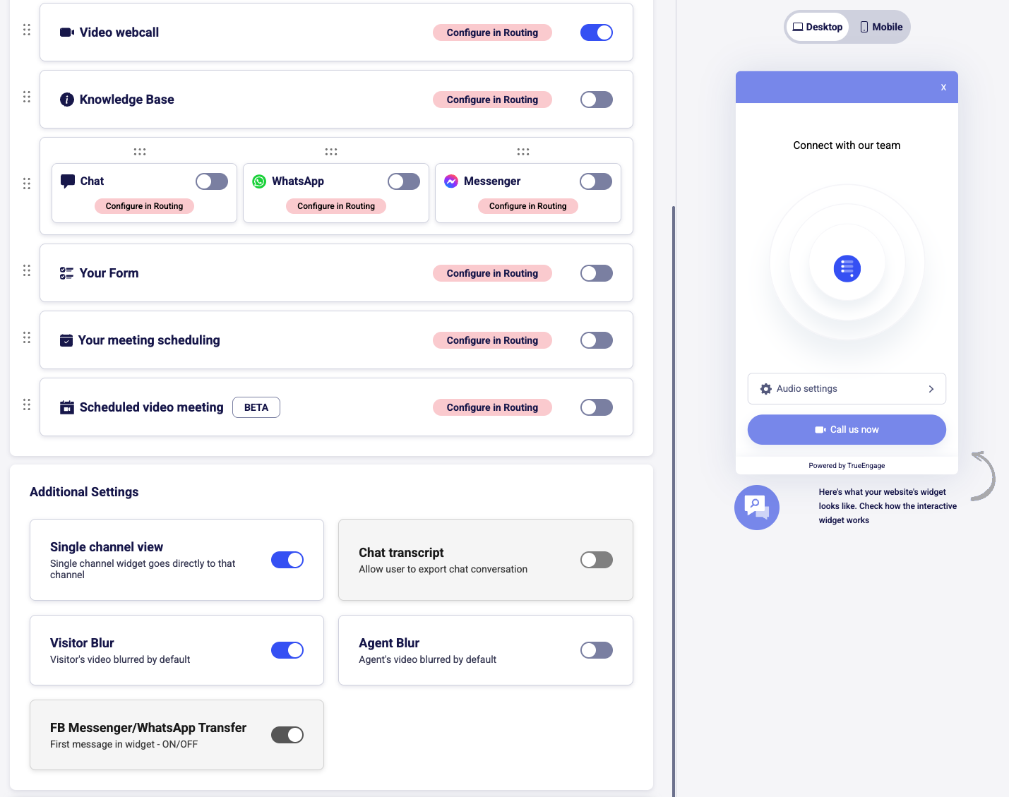 In the example below, Button and Heads-Up Engagements are turned on, so the visitor can also use a widget button to open the video channel.