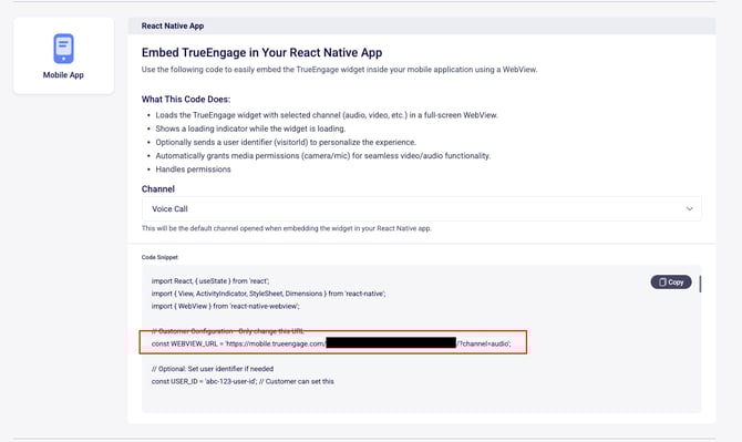 The panel will automatically generate a React Native sample code snippet containing the mobile widget URL